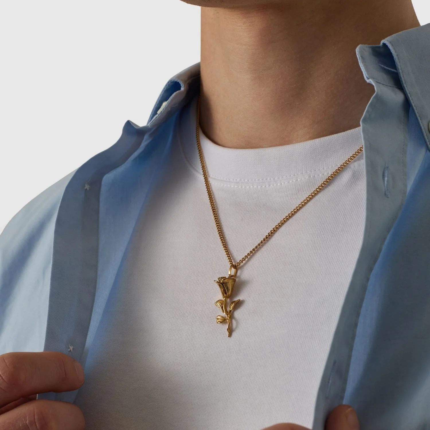 This 18K gold necklace features an intricately hand carved rose pendant, symbolising the strength that comes from embracing your imperfections. Wear it daily as a reminder that we all have our thorns to bear. Showing them isn’t a weakness. It’s a sign of growth. Suspended from a premium golden bail and 2mm Cuban chain, it’s finished with our signature scratch and fade resistant protection.